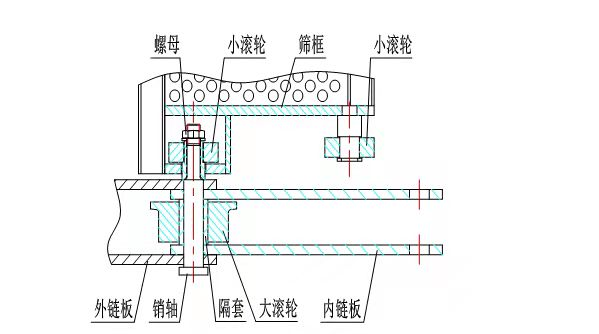 這種烘干機(jī)應(yīng)該屬于輕型烘干機(jī)。它的篩板是用單板制作的,沒(méi)有立筋做邊框,物料的承載能力會(huì)小一些,雖然有的廠家用五毫米厚的鋼板來(lái)制作篩板,但是對(duì)于垂直板面的壓力來(lái)說(shuō),抗彎強(qiáng)度是提高不了多少的。他的特點(diǎn)是外鏈板與銷(xiāo)軸和內(nèi)鏈板與軸套是鉚接連接的,所以他們之間沒(méi)有相對(duì)運(yùn)動(dòng)。他的摩擦副是銷(xiāo)軸與軸套和軸套與大滾輪。銷(xiāo)軸與軸套接觸面大,徑向壓強(qiáng)小,這樣會(huì)延長(zhǎng)鏈條的使用的壽命。他存在的問(wèn)題是,由于軸套要與鏈板進(jìn)行鉚接,為了保證軸套有一定的塑性,軸套熱處理硬度就不能太高; 在運(yùn)行時(shí),大滾輪與銷(xiāo)軸要做相對(duì)運(yùn)動(dòng),軸套硬度提不上來(lái),磨損過(guò)快,直接影響鏈條的使用壽命。因?yàn)槭倾T接鏈接,所以軸套沒(méi)法更換,一般情況就是換掉整根鏈條,更換成本大。
