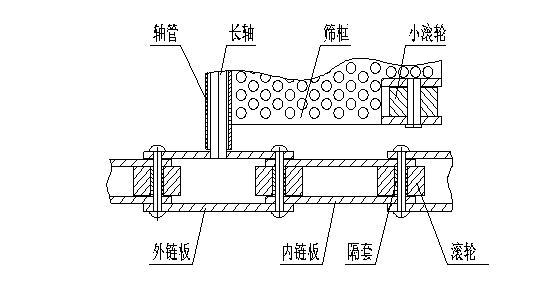 在翻板烘干機(jī)受到大家青睞的同時(shí),翻板烘干機(jī)自身固有的缺點(diǎn)也一直困擾著烘干機(jī)的使用者和設(shè)備生產(chǎn)廠家。不光是翻板烘干機(jī),其他形式的帶式烘干機(jī)也存在者同樣問(wèn)題,即滾輪、銷(xiāo)軸、軸套等運(yùn)動(dòng)部件不耐磨壽命短,而且一次更換成本大,易損件更換困難(層數(shù)越多設(shè)備就越高,更換就越困難了)。翻板烘干機(jī)的鏈條鏈板結(jié)構(gòu)如圖:
